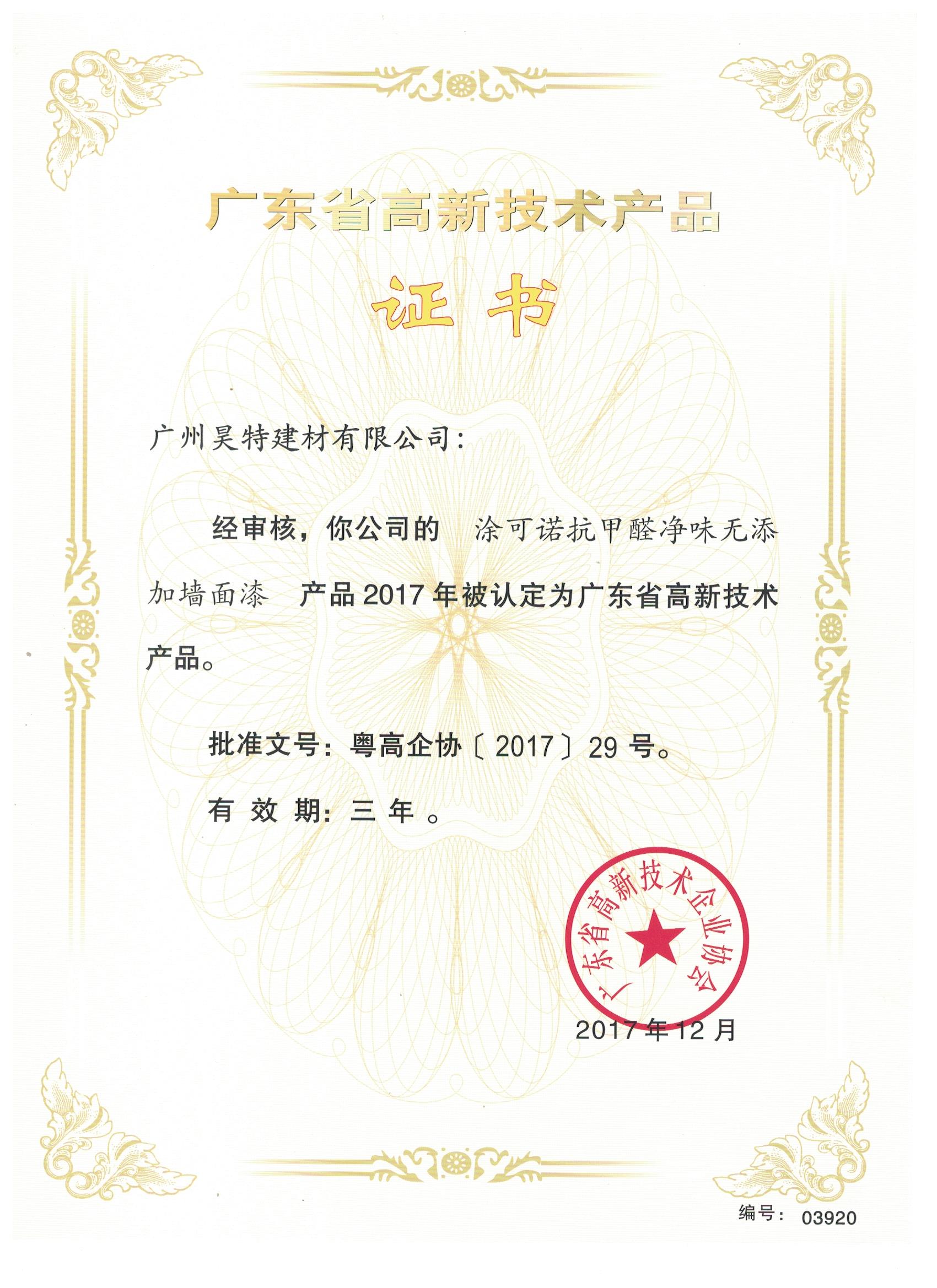 高新技术产品证书-涂可诺抗甲醛净味无添加墙面